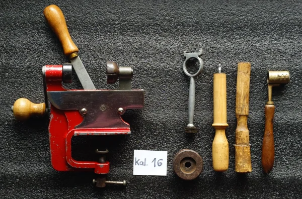 Na sprzedaż stary zestaw do elaboracji amunicji śrutowej w kalibrze 16 GA (16/70, 16/65 itp.). W skład zestawu wchodzą: zawijarka do łusek, trzpień do wybijania spłonek wraz ze stalową podstawą, ekstraktor do łusek, regulowana miarka do prochu i śrutu, drewniany ubijak. Wszystkie narzędzia są sprawne i nadają się do elaboracji współczesnej amunicji. Wysyłka paczkomatem lub odbiór osobisty w Warszawie.