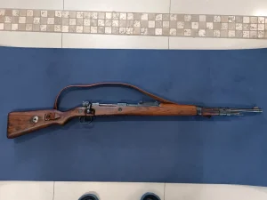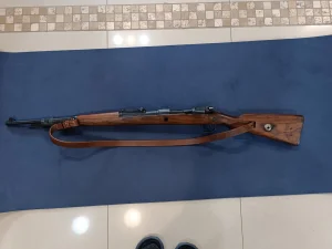 Niemiecki Mauser 98k. Zakupiony w kwietniu 2021 roku w sklapie Gunsmasters we Wrocławiu. Zarejestrowany jako Preduzece 44 z rokiem produkcji 1980 (tak było na fakturze). Nie jest to jednak mauser jugosłowiański M48 co widać na pierwszy rzut oka. Na wielu elementach widoczne „waffenamty”. Prawdziwy rok produkcji nieznany. Na komorze nabity herb Jugosławii. Data z papierów to data wprowadzenia na rynek cywilny w RFN. Dorzucam 100szt amunicji (Niemiecka z 1936 roku) zakupionej w sklepie. Stan bdb. U mnie przebieg 0 szt. Żal mi było z niego strzelać i szkoda kolekcjonerskiej amunicji.