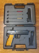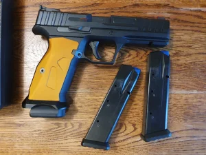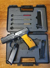 Pistolet Sport HoG RA9 - 9x19mm - Okładziny Aluminiowe Pomarańczowe Wystrzelone 450szt Dołączę kopie mojej faktury z Października 2024 aby nowy użytkownik mógł mieć gwarancję. W zestawie to co fabrycznie wyciory, płytki pod kolimator 2 magazynki (17nab), ładowarka, pudełko. Dodatkowy trzeci magazynek na 19 nab.