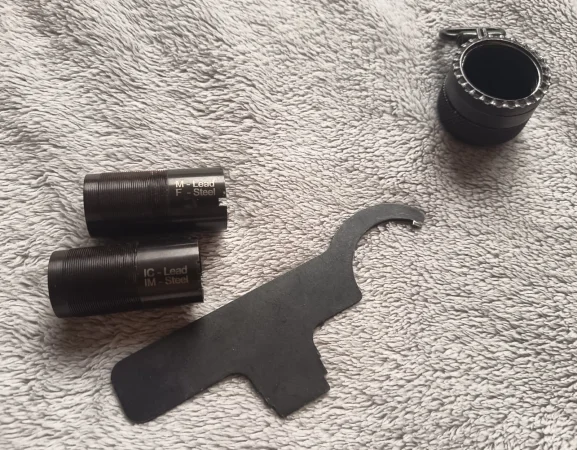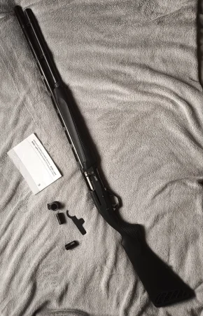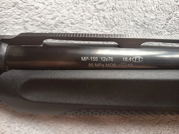 Strzelba samopowtarzalna Baikał MP-155 kal. 12/76. Jestem pierwszym posiadaczem tej strzelby. Wentylowana szyna oraz klasyczna muszka ułatwiają strzelanie z rzutu. W zestawie komplet 3 czoków, klucz do regulacji mechanizmu, instrukcja obsługi. Przedłużony magazynek o pojemności 7-8 naboi. Wystrzelone około 30 naboi.