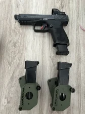 Canik TP9 Elite Combat w kolorze czarnym, rocznik 2022. Wszystko działa bez zastrzeżeń – zero zacięć przez cały okres użytkowania.