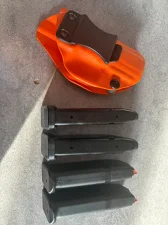 W komplecie: pistolet, stare przyrządy, kabura wewnętrzna, dwa magazynki oryginalne i dwa akcesoryjne na 15 naboi.