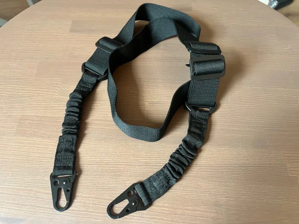 Końce ma rozciągalne, amortyzujące podrzuty broni gdy się ją nosi.