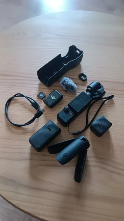 - Kamery DJI Osmo Pocket 3 z całością wyposażenia Creator Combo (plastikowe etui, pokrowiec, mikrofon z futerkiem itd.)