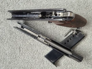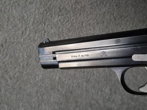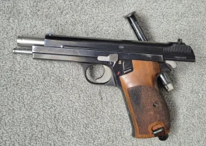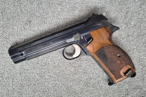 Sprzedam pistolet Sig P210 M/49 w kalibrze 9mm. Pistolet ma wytarcia oksydy jak na zdjęciach, ale poza tym jest w doskonałym stanie, zwłaszcza jak na broń z 1953 roku. Niesamowicie precyzyjnie wykonany oraz celny, zwłaszcza w porównaniu do współczesnych konstrukcji.