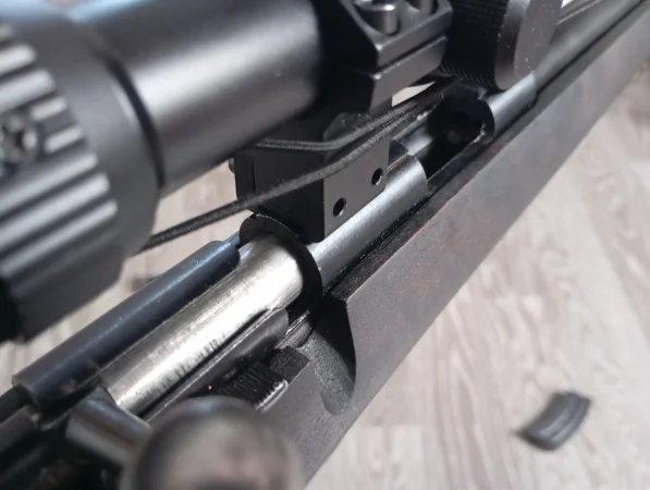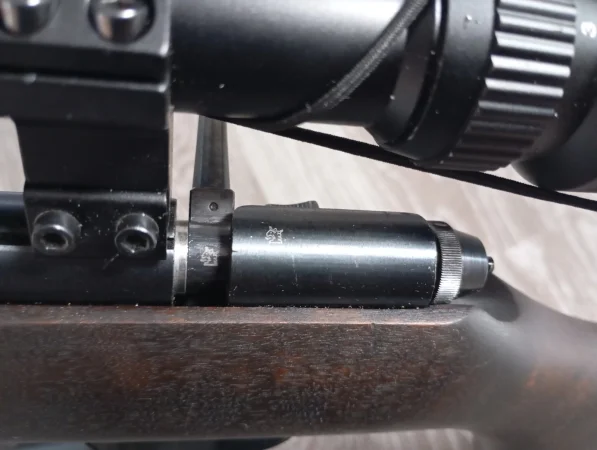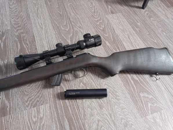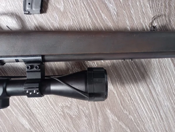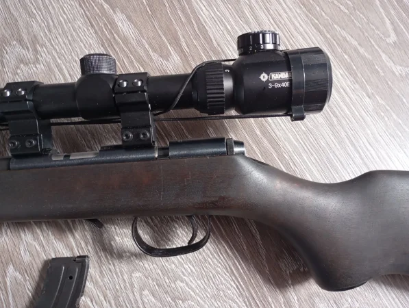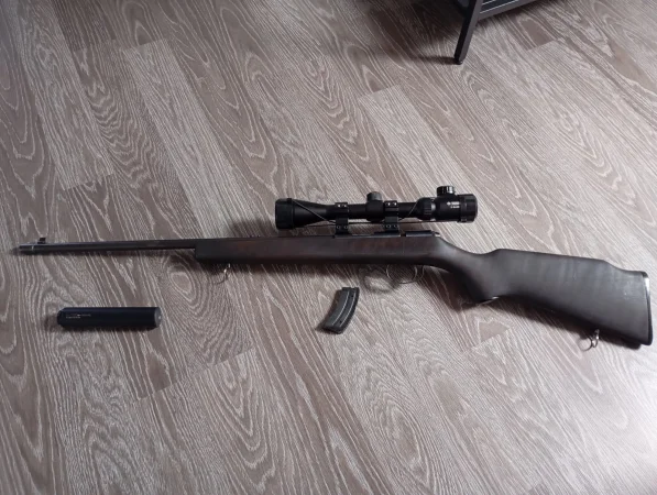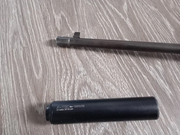Karabinek .22lr po renowacji, osada olejowana. Brak szczerbiny. Luneta Kandar 3-9x40, gwint na końcu lufy 1/2"-20 UNEF, dorobiona osłona gwintu, tłumik A-tec Wave, jeden magazynek 10-nabojowy.