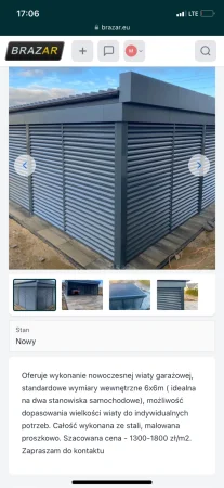 Oferuje wykonanie nowoczesnej wiaty garażowej, standardowe wymiary 6x6m ( idealna na dwa stanowiska samochodowe), możliwość dopasowania wielkości wiaty do indywidualnych potrzeb. Całość wykonana ze stali, malowana proszkowo. Szacowana cena - 1300-1800 zł/m2 w zależności od wersji wykonania. Podana cena jest ceną orientacyjną .