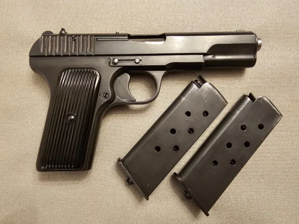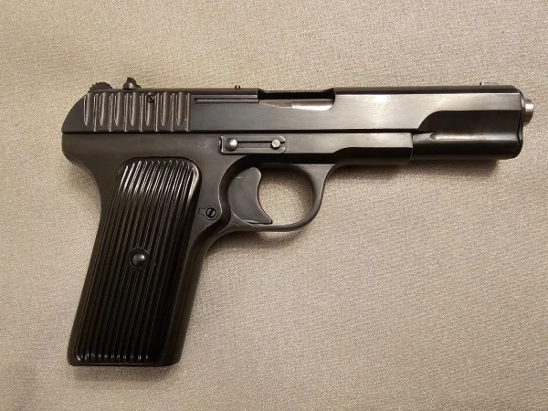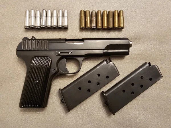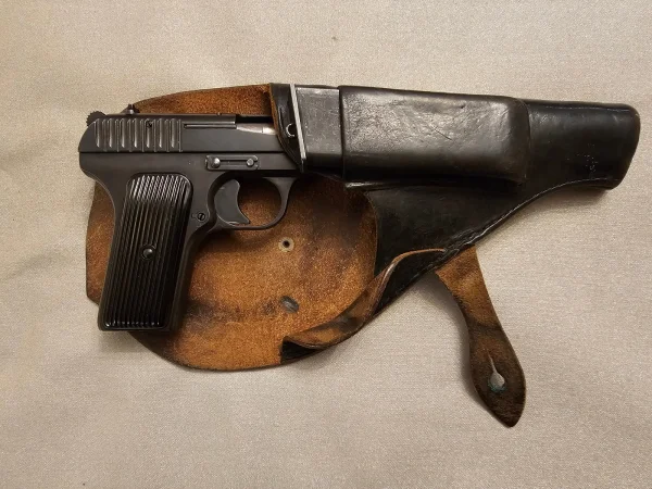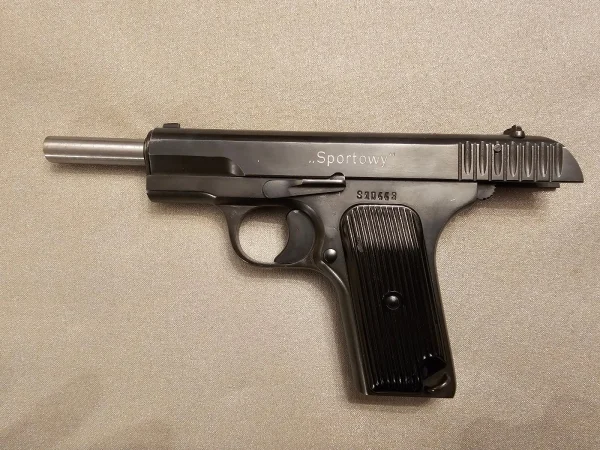 Sportowa odmiana pistoletu TT produkcji FB Radom. Stan bd. W komplecie 16 szt. kartridży, 2 magazynki, kabura.