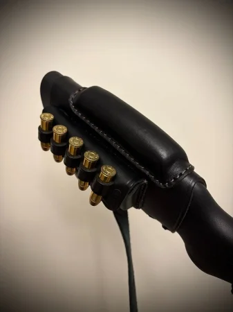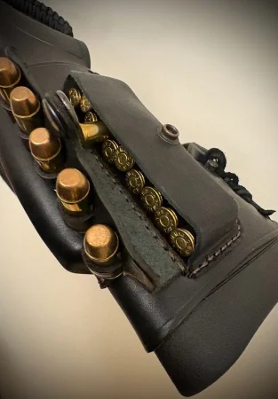 Pas z montażem do bączków, regulowane poszerzenie do pasa (comfort pad) z oczkami na naboje oraz osłona kolby z baką, ze schowkiem oraz oczkami nabojowymi.