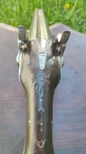 Mam na sprzedaż piękny oryginalny pistolet dwulufowy z początku XVIII w. Kaliber 13,5 mm (.54). Sygnowany nazwiskiem rusznikarza Paufile Paris (1730/1840). Jest to Pistolet cywilny, na który w tamtym czasie mogła sobie pozwolić tylko bardzo zamożna osoba. Pistolet jest bogato inkrustowany złotem i srebrem, okucia i zamnki są misternie grawerowane, kolba w z orzecha włoskiego jest w doskonałym stanie. Sprężyny są bardzo mocne, obydwa kurki idealnie zatrzaskują się w dwóch pozycjach, kominki są oryginalne i z łatwością się odkręcają. Z encyklopedii dla rusznikarzy Stöckel Vol.II s. 2. 925, możemy się dowiedzieć, że Paufile pracował w Paryżu w latach 1723-1724. (Posiadam skan str. 925 z powyższej pozycji). W pierwszej połowie XIX wieku pistolet został dostosowany do inicjowania zapłonu za pomocą kapiszonów, co było bardzo powszechną praktyką. Należy podkreślić, że Francuskie prawo w tamtym okresie mocno ograniczało eksport własnej broni palnej, dlatego w przeciwieństwie do innych produkcji jest ich na rynku tak niewiele.