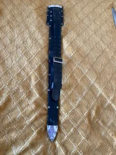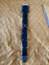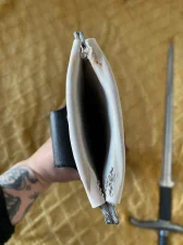 Pochwa że skóry naturalnej, z pasem do noszenia przez plecy, widoczne na niej ślady zużycia.