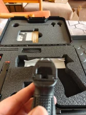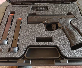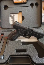 chętnie odstąpię pistolet Steyr L9A2 z charakterystycznymi, trapezoidalnymi przyrządami.