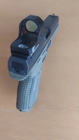 Aktualnie zamiast szczerbinki zamontowana jest płytka pod kolimator - kupiona w Halinka Arms https://www.halinka-arms.pl/czesci-i-akcesoria-do-broni/3824-podstawka-montazowa-pod-kolimator-do-pistoletow-steyr-a1a2-outerimpact.html