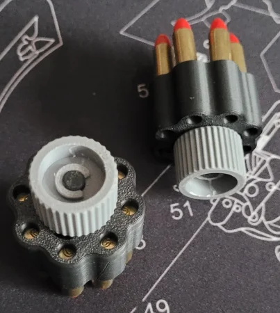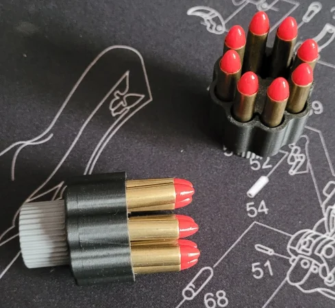 2 speedloadery do rewolwerów 22WMR z bębnem 8 nabojowym na small frame. Na pewno będą pasować do Taurus 941/942 Dodaję też 16 zbijaków zrobionych z odstrzelonych łusek.