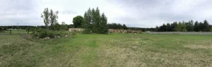 2. Działka ogrodzona częściowo płotem betonowym, częściowo siatką ochronną.