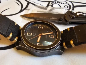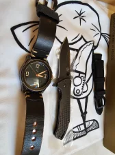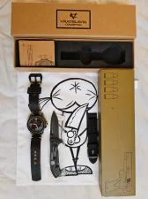 W zestawie opakowanie oryginalne, nożyk z grawerunkiem od producenta zegarka i oryginalny pasek plus dorabiany skórzany.