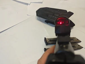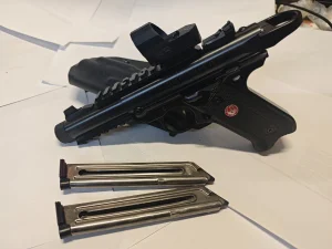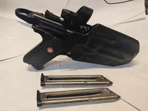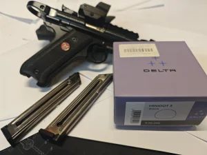 Witam jak w temacie sprzedam pistolet tarczowy Ruger Mark IV Tactical z kolimatorem Delta Mini Dot 3, pierścieniem przeładowania oraz kaburą. W zestawie znajdują się 2 magazynki. Na końcu lufy jest gwint na którym można zamontować kompensator lub tłumik huku. Pistolet mało strzelany. Jest to wersja full metal. Cena bez kolimatora 3600 zł.