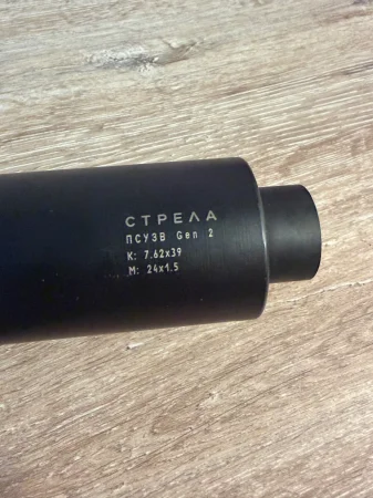 Sprzedam używany tłumik Strela Gen 2 kaliber 7.62, gwint 24x1.5. Przelot około 1000 sztuk, widoczne ślady użytkowania na górze tłumika.