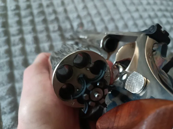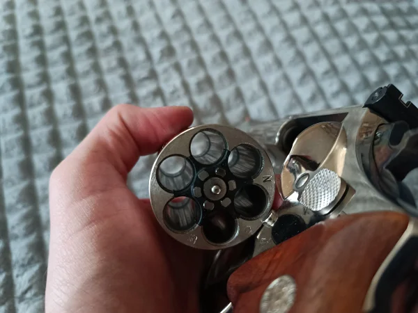 Kolekcjonerska perełka, bo jedna z rzadziej występujących w przyrodzie wersji modelu 29-2, czyli w powłoce niklowanej (zaryzykuję, że w Polsce takiego nie ma), oczywiście jest to jeszcze generacja "pinned & recessed". Spust i kurek w przepięknej ogniowej oksydzie oraz oryginalne okładki z medalionami. Ważne kolekcjonersko, brak widocznych bić czy odbiorów. Z moich ustaleń wynika, że rewolwer pochodzi z 1980 roku.