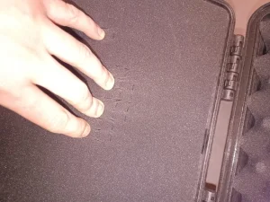 Skrzynka plastikowa z wypełnieniem piankowym. Pianki ponacinane co ułatwi nowemu posiadaczowi aranżacje według własnych potrzeb. Konstrukcja sztywna z grubego tworzywa. Wymiary wewnętrze po wyjęciu wszystkich pianek to 32,5x23x12,5cm