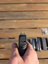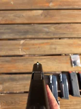 Zdemontowane zostały fabryczne przyrządy celownicze oraz zwalniacz magazynka(dodaję do zestawu). Aktualnie zamontowane są przyrządy TRUGLO Tritium Pro oraz metalowy zwalniacz magazynka Shield Arms.