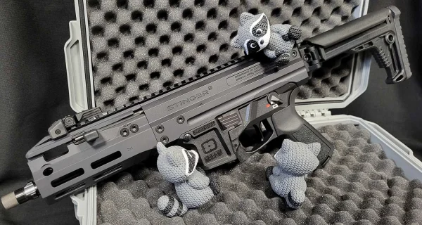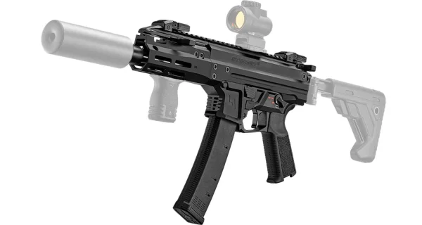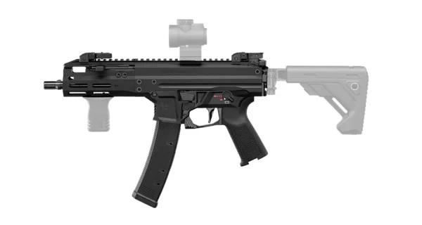 Od strony użytkowej Stinger 9 jest dopracowany jako platforma bez słabych stron w obsłudze. Manipulatory są obustronne, więc bezpiecznik, zrzut zamka i zwalnianie magazynka pracują symetrycznie, a sama konstrukcja nie faworyzuje ani prawej, ani lewej ręki. Zasilanie przewidziano pod magazynki CZ Scorpion EVO 3, a dodatkowo zachowano dwa sposoby wypięcia magazynka: klasyczną dźwignię oraz przycisk w stylu AR, co pozwala dobrać sposób obsługi do wypracowanych nawyków. Na tym tle dobrze wypada też układ przeładowania: zastosowano dwie niezależne dźwignie – klasyczną rączkę w standardzie AR oraz boczną dźwignię znaną z konstrukcji MP5/Scorpion, z możliwością montażu przedniej dźwigni po lewej lub prawej stronie. Broń można skonfigurować pod konkretny styl pracy, a zbędny element po prostu zdemontować.